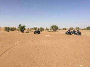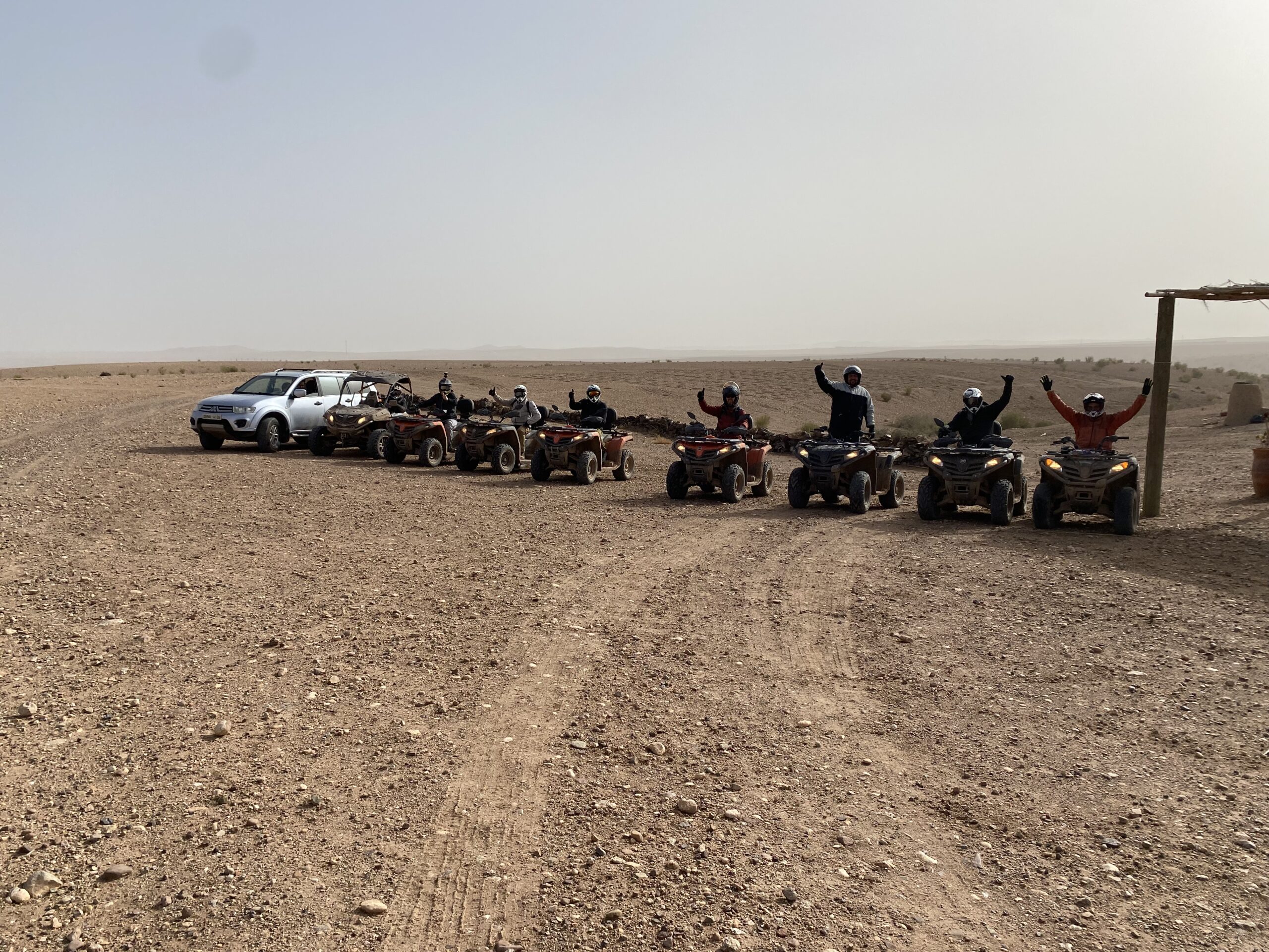 Cette demie journée exceptionnelle : 3H30 heures la demi journée en quad ( transfert compris*), une grande balade dans le désert d’Agafay aux portes de Marrakech. Pause thé et crêpes au miel et huile d’olive en plein désert d’Agafay, le transfert aller/retour *.